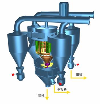 高細(xì)轉(zhuǎn)子式選粉機(jī)(人工制砂專用)是黎明重工經(jīng)多年研究開發(fā)的外部循環(huán)式帶轉(zhuǎn)子的改進(jìn)型選粉機(jī),它是在轉(zhuǎn)子式選粉機(jī)的基礎(chǔ)上,將平面渦流理論運(yùn)用在旋風(fēng)式選粉機(jī)設(shè)計(jì)而成。經(jīng)實(shí)踐使用證明,選粉效率達(dá)85%以上,而且細(xì)度調(diào)節(jié)方便、靈活、性能可靠。
